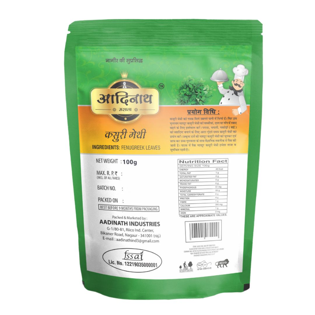 Packed with care to preserve its rich flavor and aroma, Aadinath Spices ensures the finest quality Kasuri Methi for all your culinary needs.